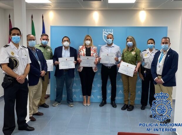 La Policía Nacional ha reconocido esta mañana en Málaga la impecable labor desarrollada en la pandemia por el personal de seguridad privada que presta servicio en centros sanitarios de la capital. En un sencillo acto que ha tenido lugar en el Hospital Regional Universitario de Málaga y el Hospital Universitario Virgen de la Victoria, la Unidad Territorial de Seguridad Privada ha concedido 12 menciones honoríficas a vigilantes de seguridad.