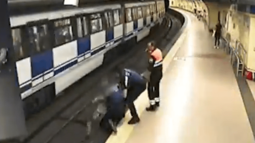 Agentes de la Policía Municipal de Madrid y de la seguridad privada de Metro de Madrid han intervenido para evitar un atropello en las vías de la estación de Lavapiés. Las imágenes corresponden al momento del rescate. La rapidez de los agentes ha evitado un peor desenlace.