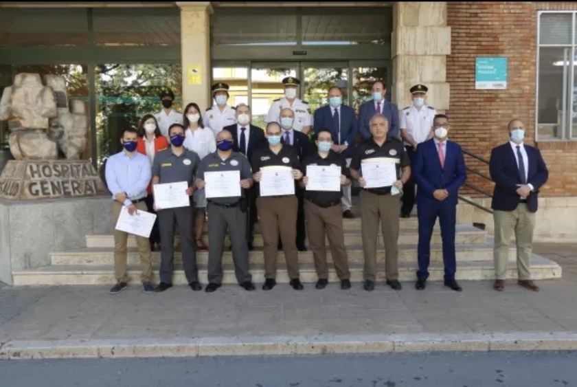 Este jueves, en el salón de actos del Hospital Obispo Polanco de Teruel se ha llevado acabo un acto de entrega de Menciones Honoríficas Tipo “B” como reconocimiento a la labor que los profesionales del sector de la Seguridad Privada desempeñan, especialmente este pasado año, donde los vigilantes de seguridad privada que prestan servicio en Centros Hospitalarios y Sanitarios, estuvieron en primera línea, sumándose así en la lucha contra la pandemia, contribuyendo a salvaguardar el funcionamiento de los servicios esenciales en centros sanitarios de la Provincia de Teruel ,según se explica en una nota de prensa.