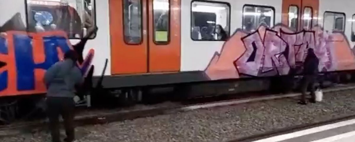 Como se puede ver en el vídeo de ADN Sindical, hasta seis grafiteros que habían bajado a las vías hicieron uso de sus esprays a la altura de diferentes vagones del tren mientras los vigilantes de seguridad intentan disuadirlos sin éxito desde el andén.